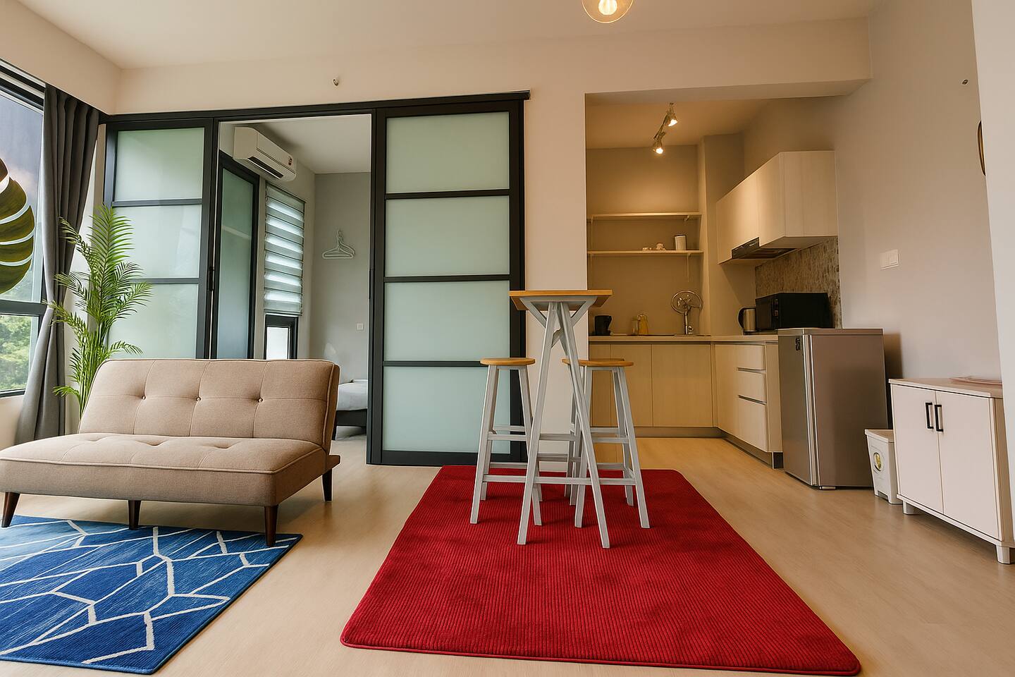 -Appartement de 46 m² conçu pour accueillir jusqu’à 4 personnes -1 lit Queen + 1 lit Super Single + 1 canapé-lit -Climatisation dans toutes les pièces -Espace salon confortable avec Smart TV & WiFi gratuit -Kitchenette avec équipements de base pour cuisiner & coin repas