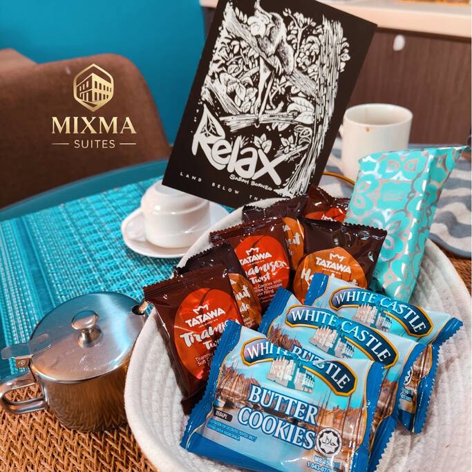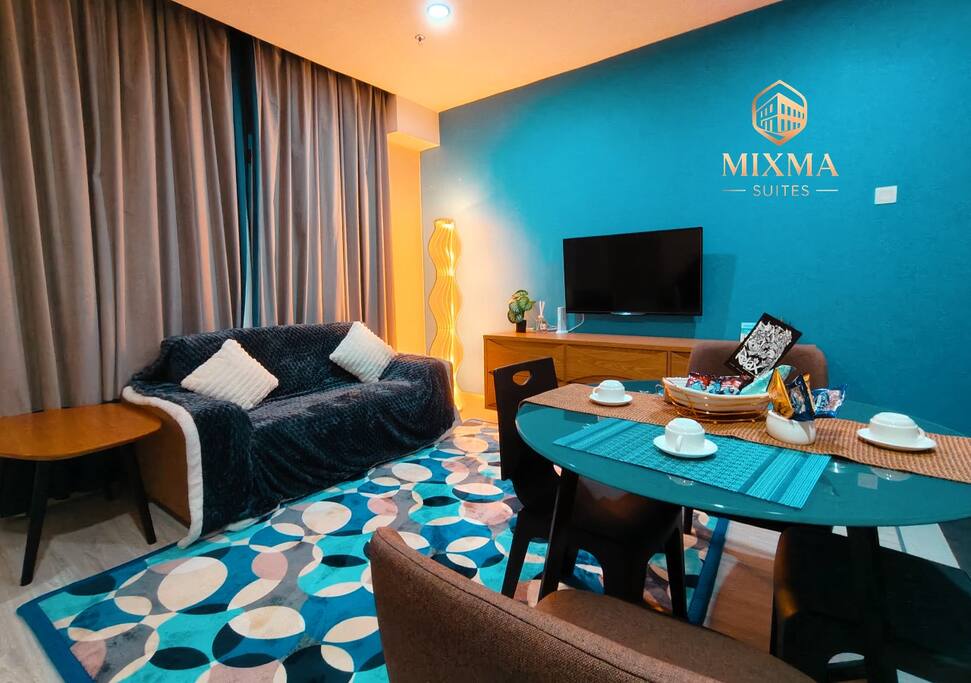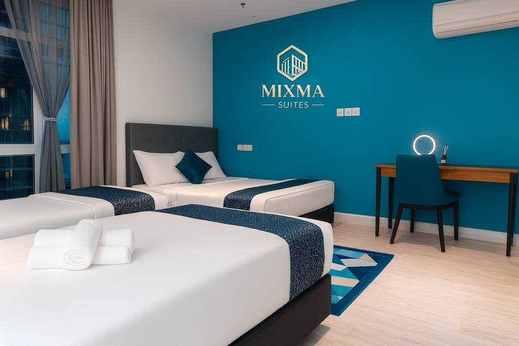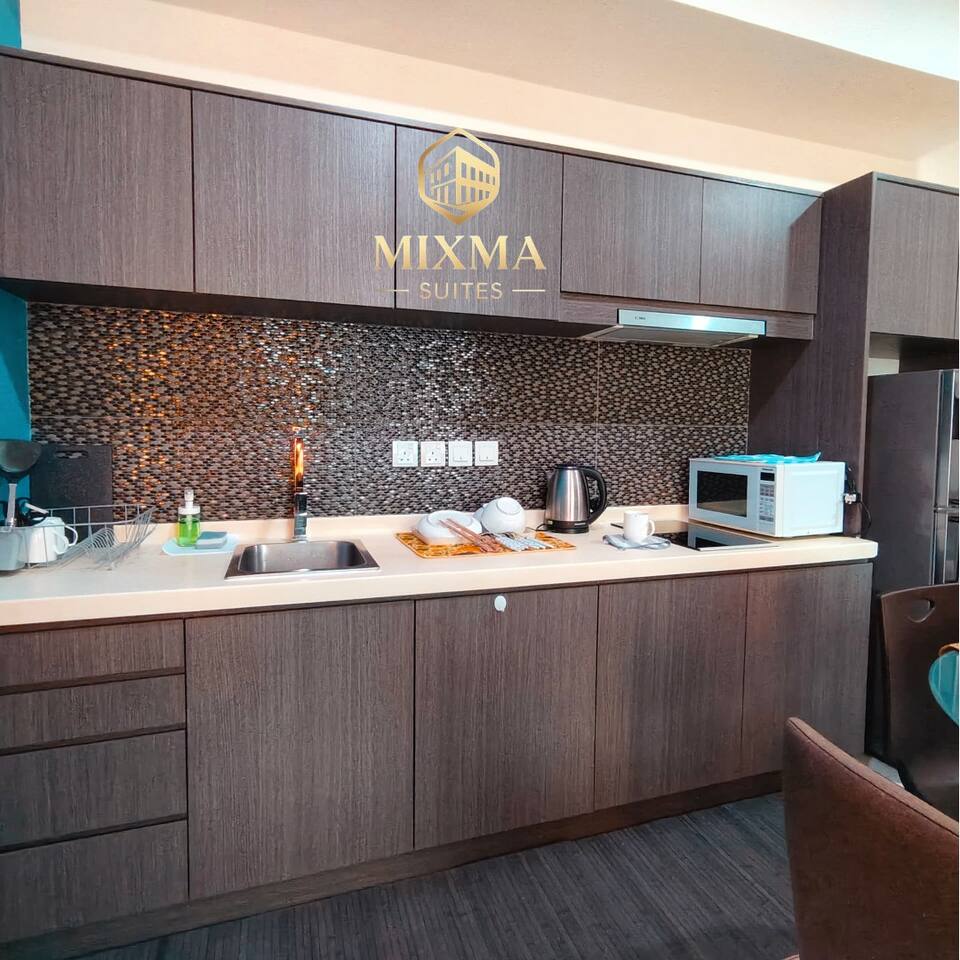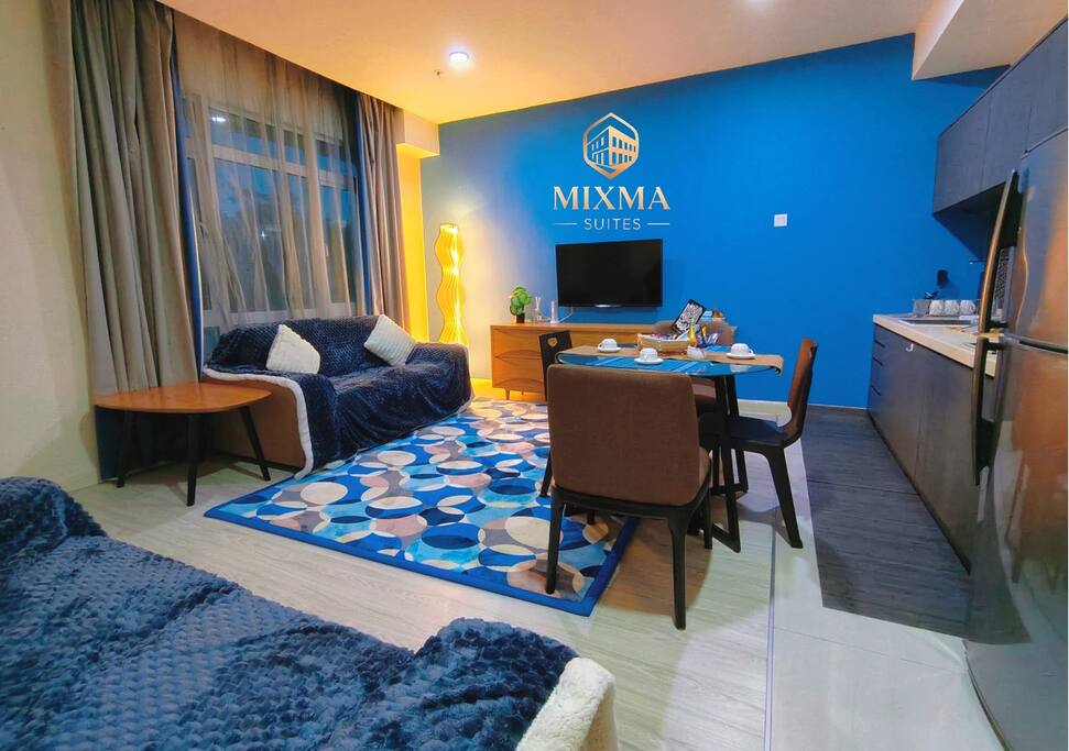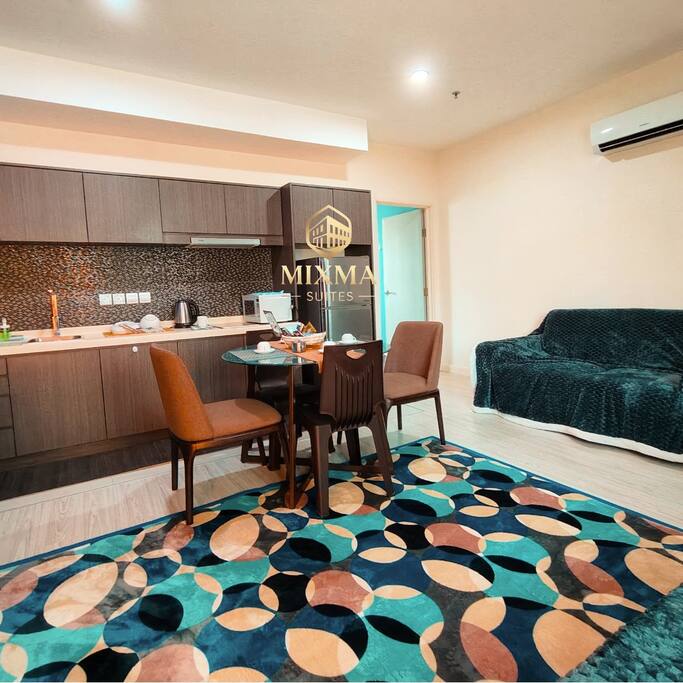 Our suite features a spacious bedroom with premium bedding, a cozy living area with 2 sofas and smart TV (Netflix ready), and a fully equipped kitchenette for light cooking. Guests can relax with high-speed WiFi, air-conditioning, and hotel-standard amenities. Large windows provide natural light and views of Kota Kinabalu’s skyline or sea view, making your stay both comfortable and memorable.