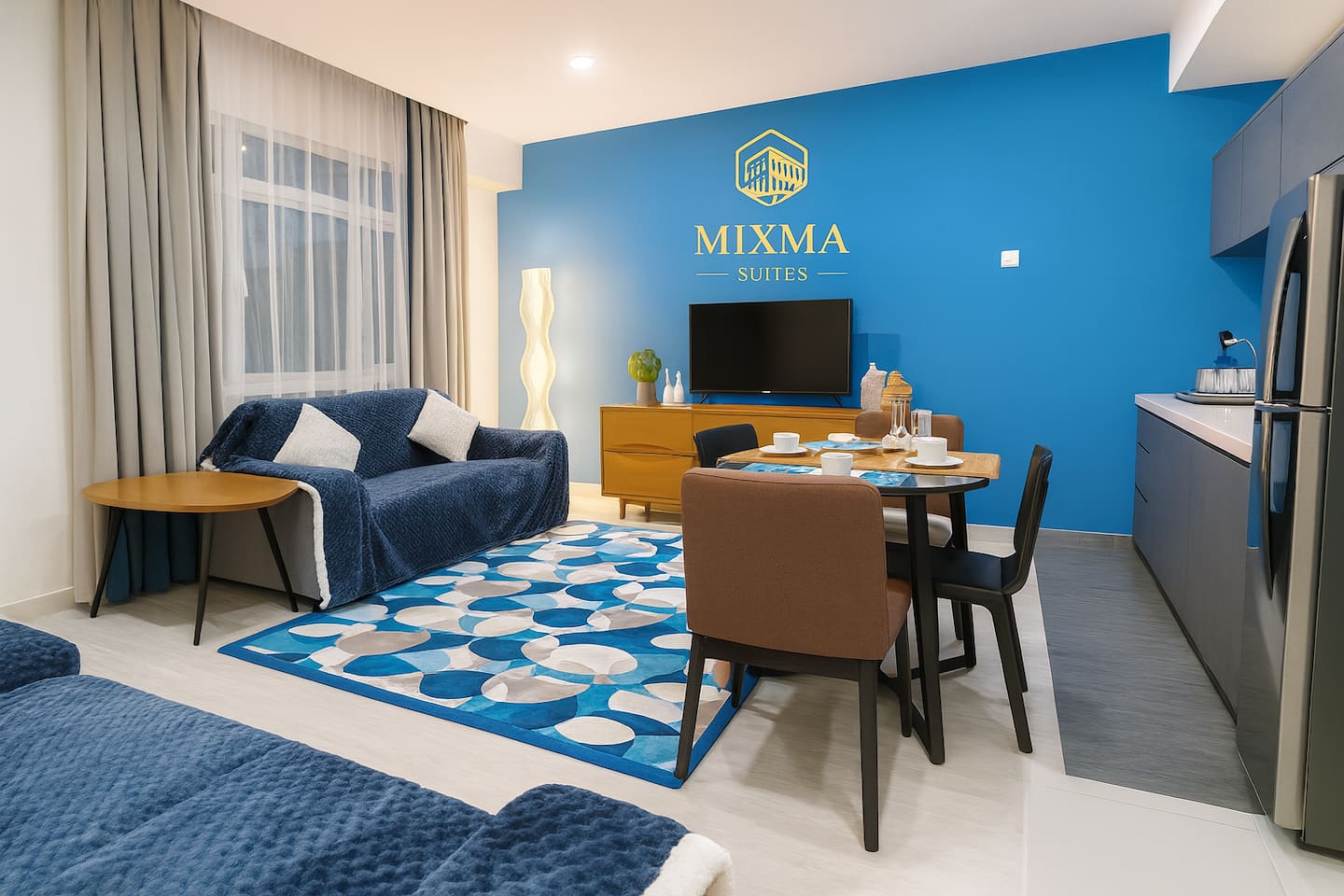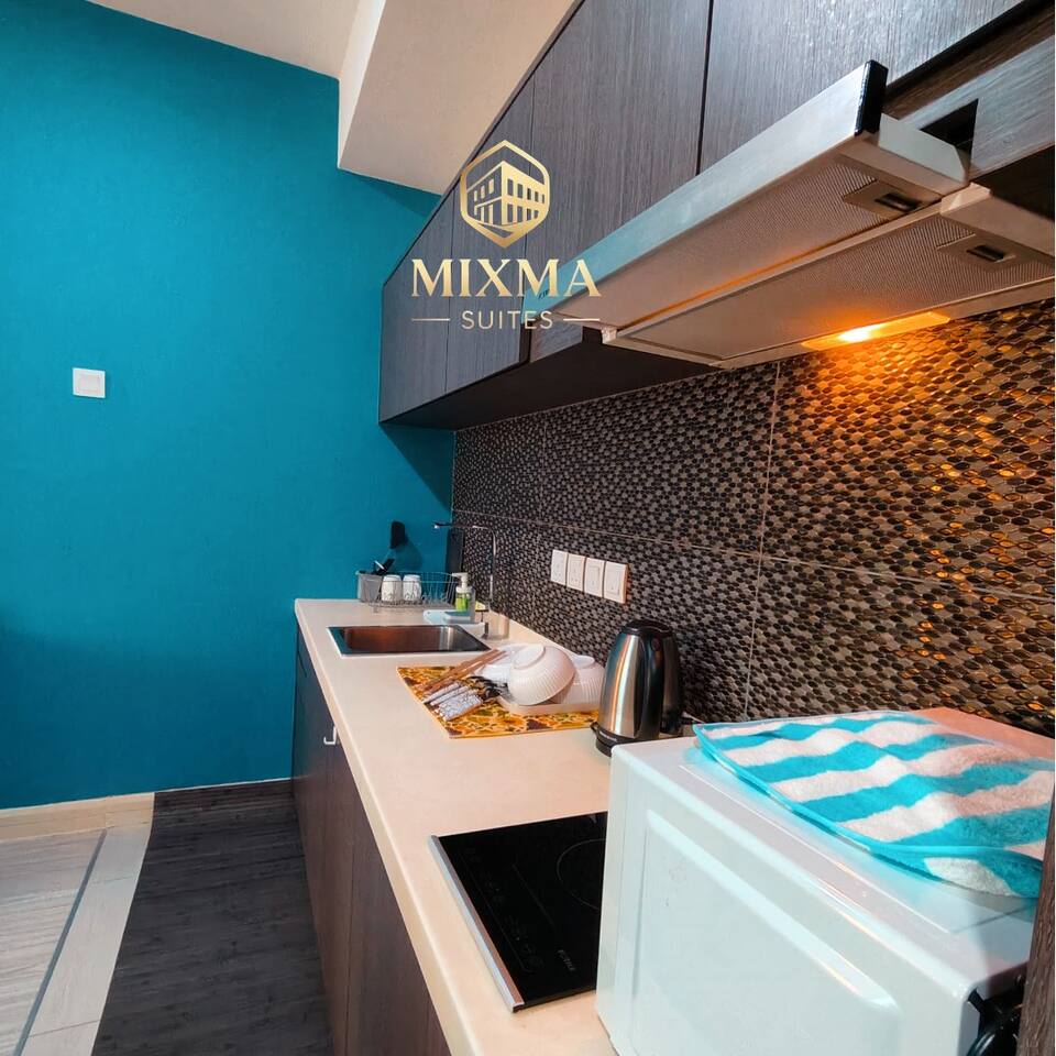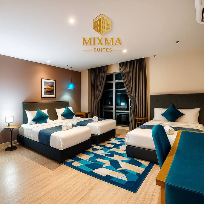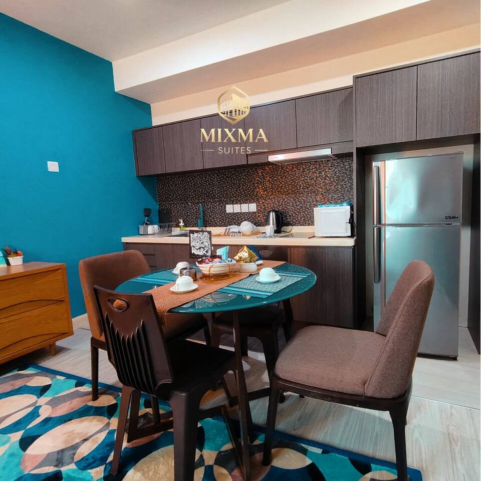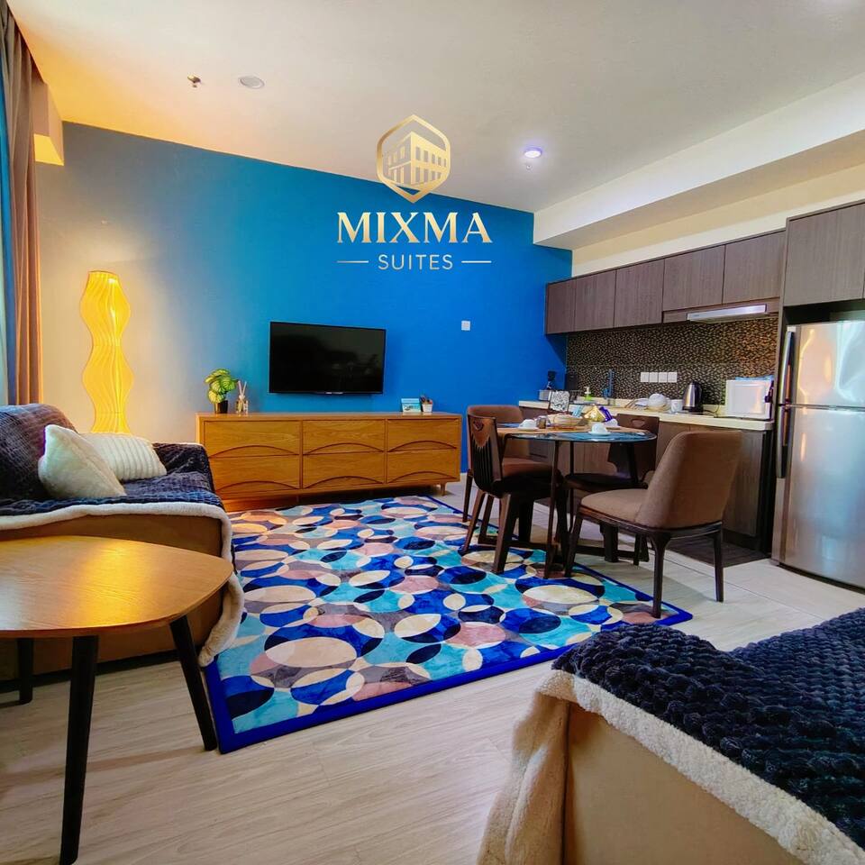 Our suite features a spacious bedroom with premium bedding, a cozy living area with 2 sofas and smart TV (Netflix ready), and a fully equipped kitchenette for light cooking. Guests can relax with high-speed WiFi, air-conditioning, and hotel-standard amenities. Large windows provide natural light and views of Kota Kinabalu’s skyline or sea view, making your stay both comfortable and memorable.