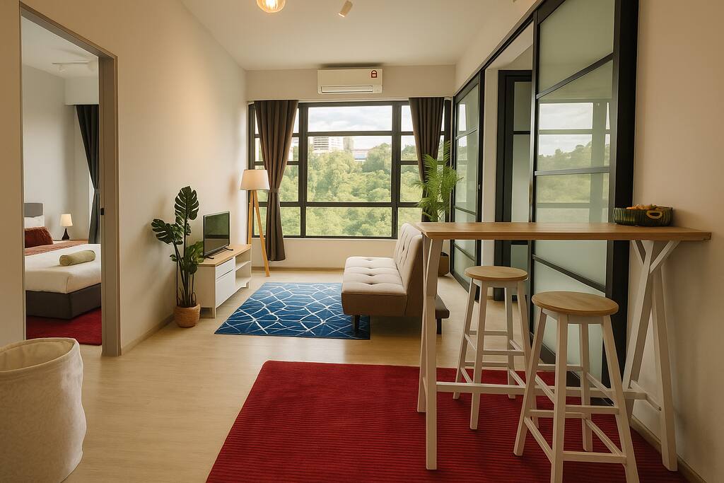 -500 sqft apartment designed for up to 4 guests -1 Queen Bed + 1 Super Single Bed + 1 Sofa Bed -Air-conditioning in all rooms -Cozy living area with Smart TV & free WiFi -Kitchenette with basic cooking facilities & dining space